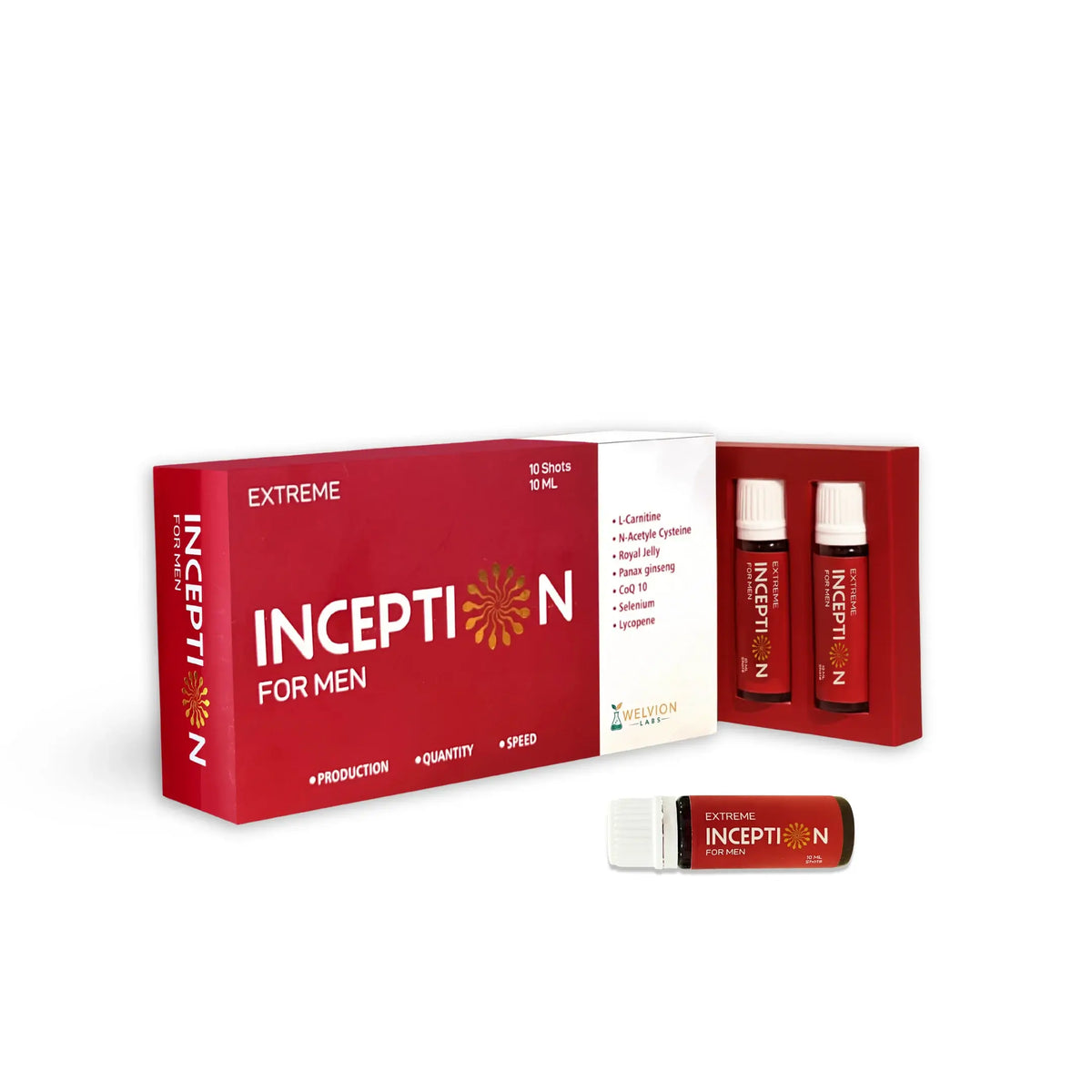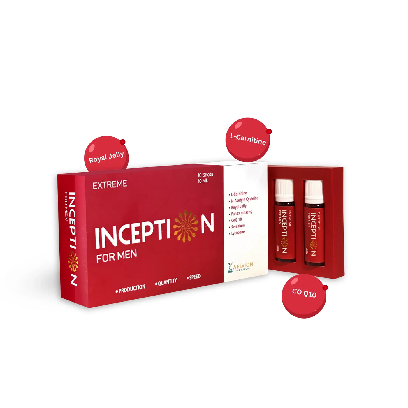 Inception for Men is a 10 ml daily oral shot formulated with amino acids, antioxidants, adaptogens, vitamins, and minerals to support sperm health, erectile performance, and overall male reproductive wellness.